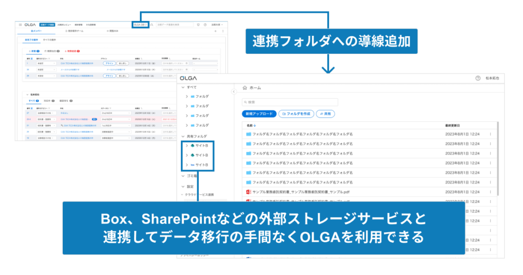 本機能は、社内で長年蓄積されてきた契約書や関連資料を移行することなく、OLGA上から参照できるようにするもので、導入時の工数・コストを大幅に削減するとともに、過去の判断プロセスや契約書の蓄積といった「先人の知恵」を法務ナレッジとして即時活用できる環境を実現します。