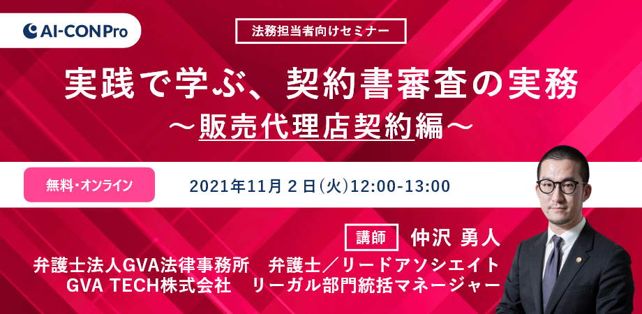 弁護士による販売代理店契約書の審査実務のエッセンスを学べる機会です。ぜひご参加ください。