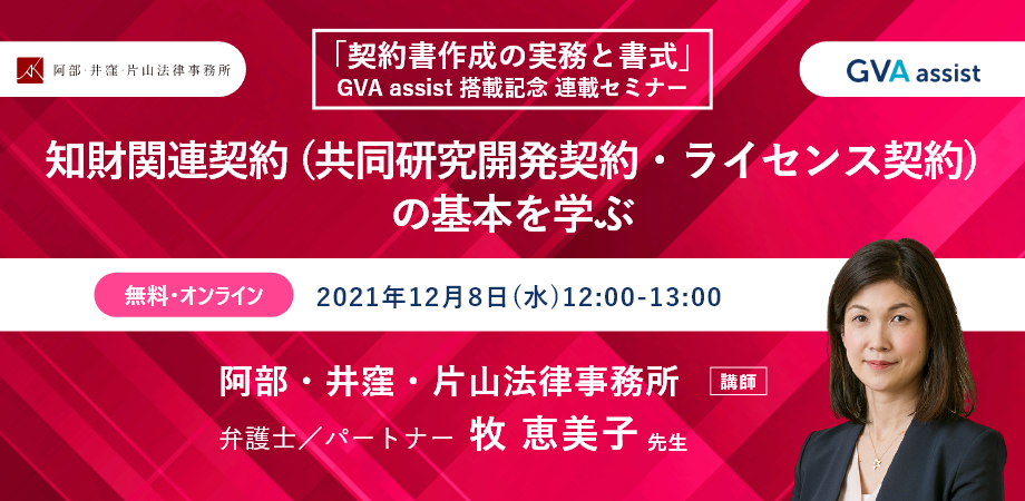 セミナータイトル | 「契約書作成の実務と書式」GVA assist 搭載記念セミナー 知財関連契約 (共同研究開発契約・ライセンス契約)の基本を学ぶ |