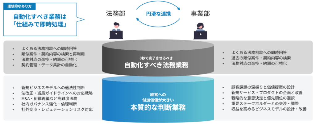 これからの法務部門に求められるのは、定型的な業務は適切にAIに任せ、人はより高度な戦略的業務に注力するという発想です。AIと人が役割を分担し、それぞれの強みを最大化することが「効率化とリスク管理の両立」につながります。