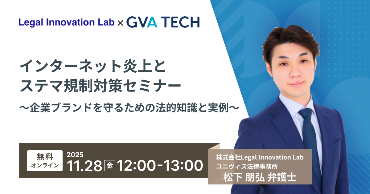 本セミナーでは、株式会社Legal Innovation Lab 弁護士 松下 朋弘 様を講師にお迎えし、企業の法務・コンプライアンス部門、広告審査部門、そして実際に広告を運用する実務部門の方々を対象に、インターネット炎上の最新事例とその分類から、景表法(ステマ法)の概要、最近の規制トレンドまでを分かりやすく解説します。