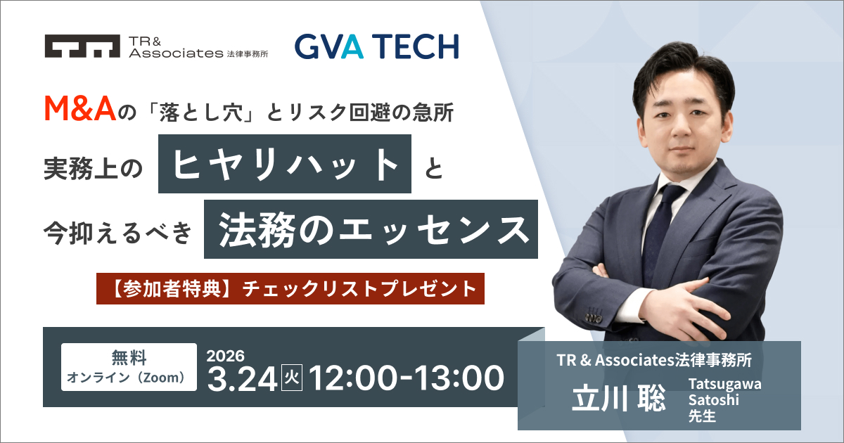本セミナーでは、TR & Associates 法律事務所の立川 弁護士を講師に迎え、M&A実務の現場で抑えておくべき要諦を解説します。入門的な基礎知識を軸としつつ、現場で起こりやすい「ヒヤリハット」や、今知っておかなければならない先端的な法務の知見を網羅。「これを見落とすと危ない」という実務上の急所を、専門家の視点から具体的かつ分かりやすくお伝えします。