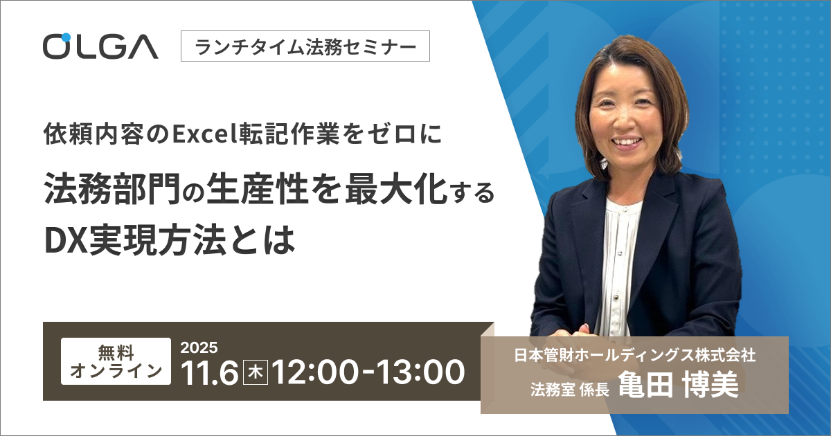 本セミナーでは、日本管財ホールディングス株式会社 法務室 亀田 博美 様をお招きし、同社が法務オートメーション「OLGA」を導入することで、これらの課題をいかに克服し、法務業務のDXを実現したのかを解説します。
